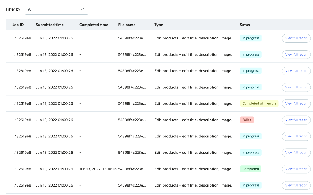 Pour en savoir plus sur les chargements de listings via CSV, veuillezcliquez sur Voir le rapport complet dans la colonne Action. Sur la page du rapport correspondante, les vendeurs peuvent voir le nombre de lignes chargées avec succès, le nombre de lignes contenant des erreurs, des détails sur l'état de la vérification et les informations de base des fichiers CSV.