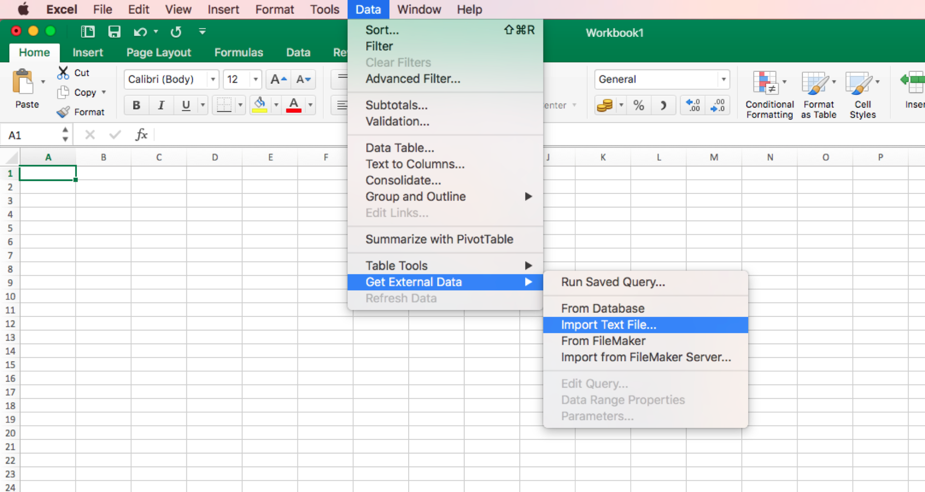 Então vá para Dados > Obter dados externos > Importar arquivos de texto