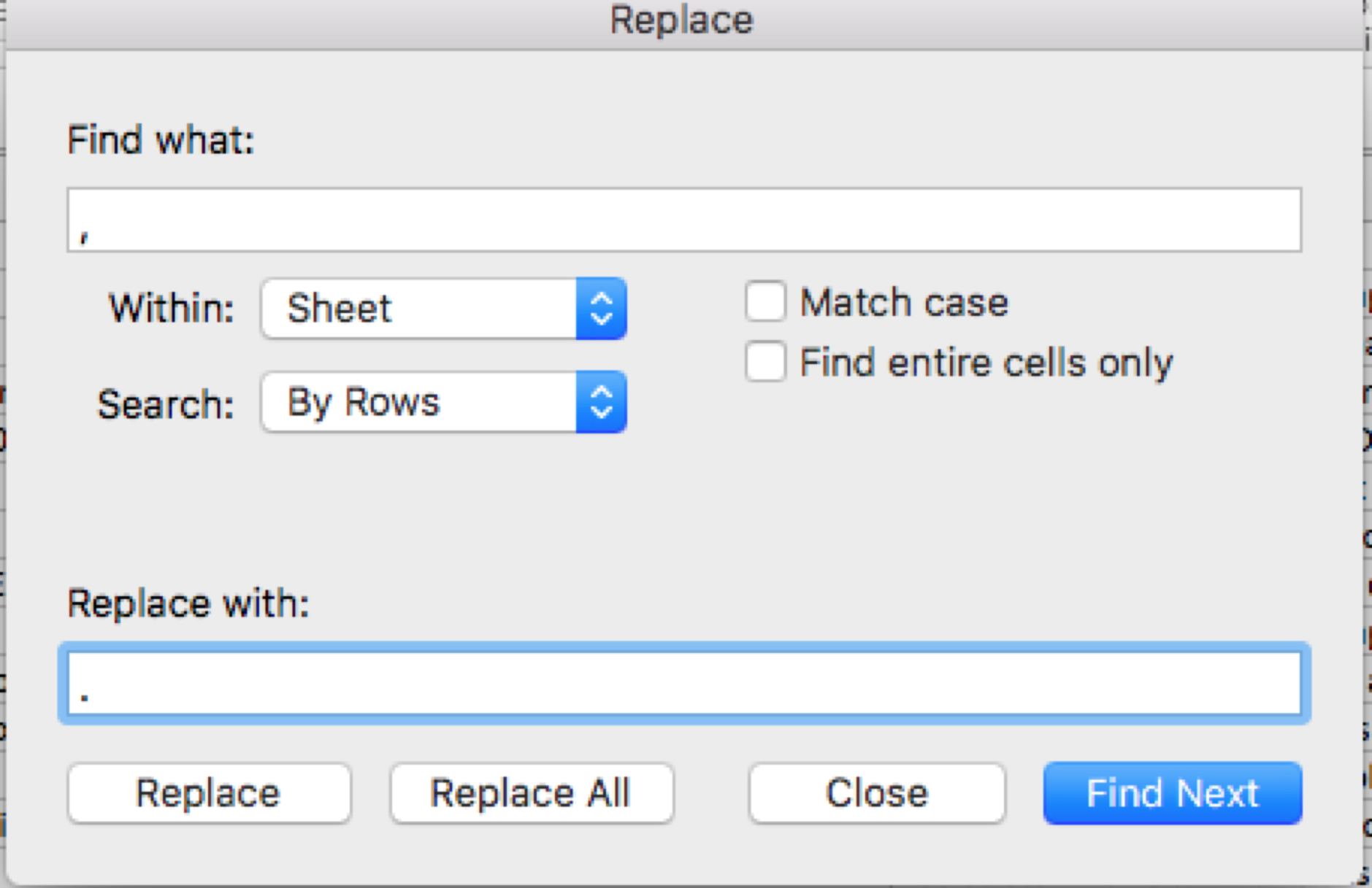 Em Localizar, coloque vírgula, em substituir, insira ponto.