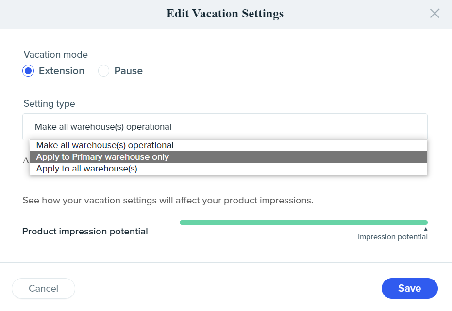 2. Clique em "Editar configurações de férias" para selecionar "Extensão" ou "Pausa" na janela popup a seguir. Escolha entre as opções "Aplicar somente ao armazém principal" ou "Aplicar a todos os armazéns" e depois defina uma data de início e uma data de término.