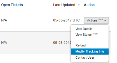 如需更新物流单号,请在商户平台的顶部栏点击“订单”>“历史记录”。找到您需要修改的订单,然后点击该行的“操作”按钮。从该菜单中选择“修改物流跟踪信息”。