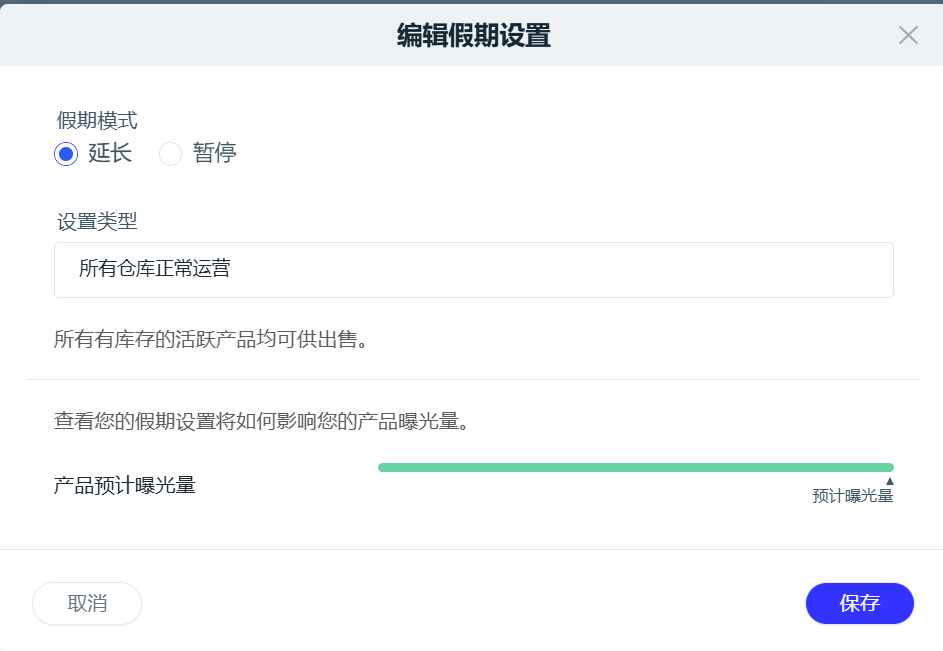 2. 点击“编辑假期设置”,然后从显示的弹窗中选择“延长”或“暂停”模式。选择“仅适用于主仓库”或“适用于所有仓库”,然后根据自身情况设定假期的开始日期和结束日期。