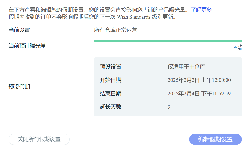 此选项将延长主仓库所有订单的履行时限。商户可以设定的假期天数为一到七个自然日,设置完毕后,主仓库的产品订单的履行时限将自动延长,延长天数与商户设置的假期天数相同。请注意,向用户显示的预计到货日期也会相应往后延。