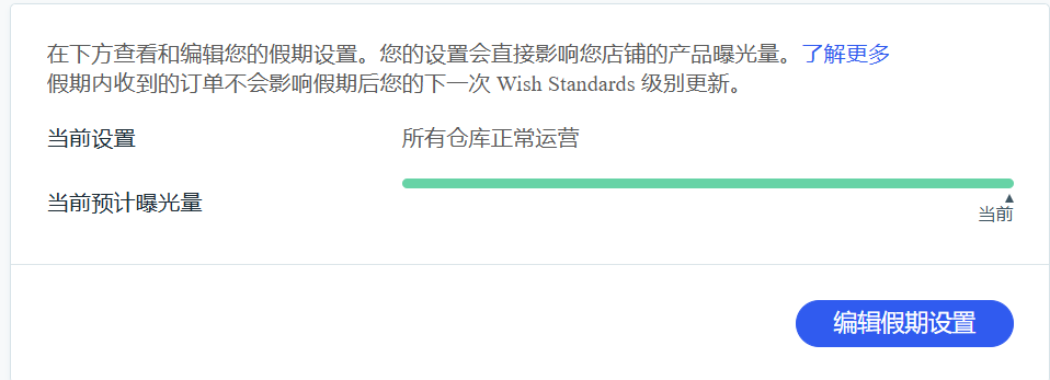 | 所有仓库正常运营 | 这是默认选项,表示所有订单均受《商户政策》“履行”部分规定的履行时限约束,即必须在订单释放后的五个自然日内标记发货。 |