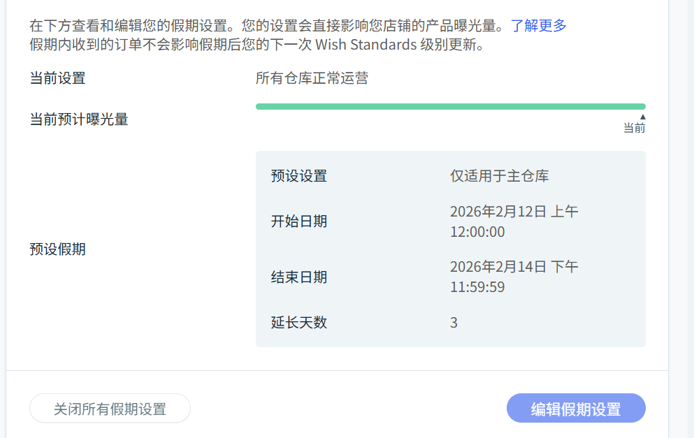 此选项将延长主仓库所有订单的履行时限。商户可以设定的假期天数为一到七个自然日,设置完毕后,主仓库的产品订单的履行时限将自动延长,延长天数与商户设置的假期天数相同。请注意,向用户显示的预计到货日期也会相应往后延。